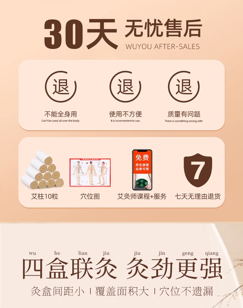 这款无烟艾灸盒是一款非常实用的养生产品。它采用四盒联灸的设计,使得灸劲更强,覆盖面积更大,可以更好地覆盖穴位,避免遗漏。同时,它的灸盒间距小,这样可以更好地控制艾灸的温度和时间,保证艾灸的效果。