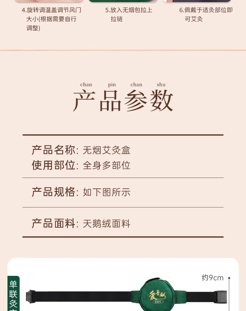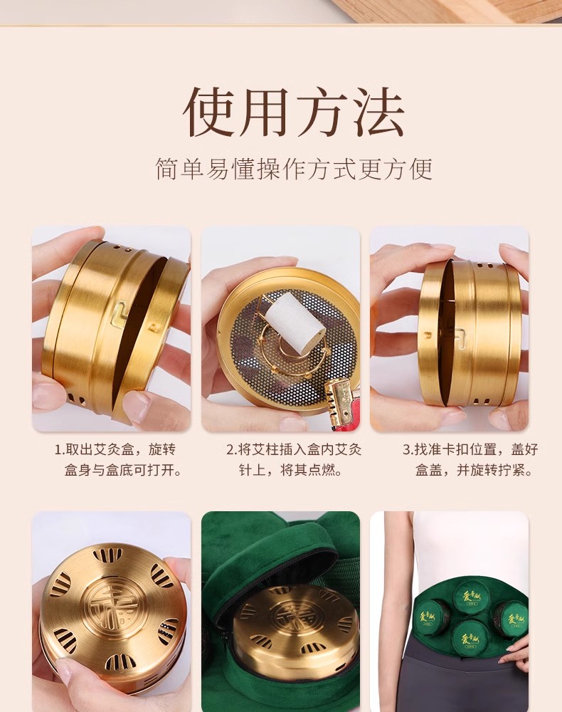 使用这款无烟艾灸盒非常简单方便,只需将艾柱插入灸盒中,然后点燃艾柱,盖上灸盒盖子,将灸盒放置在需要艾灸的部位,再用松紧带固定即可。使用过程中,可以调节艾柱的高度,以适应不同的穴位和部位。