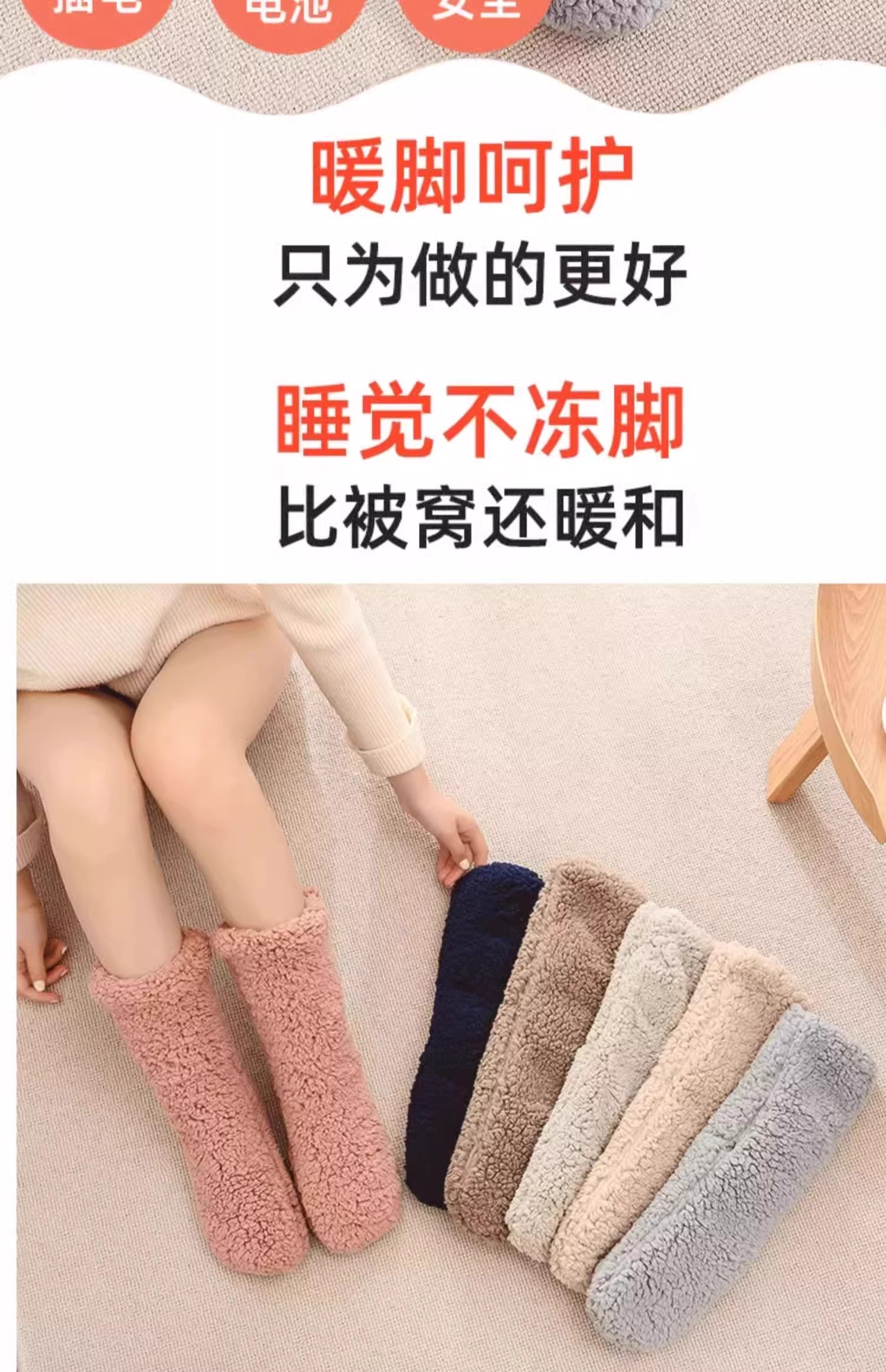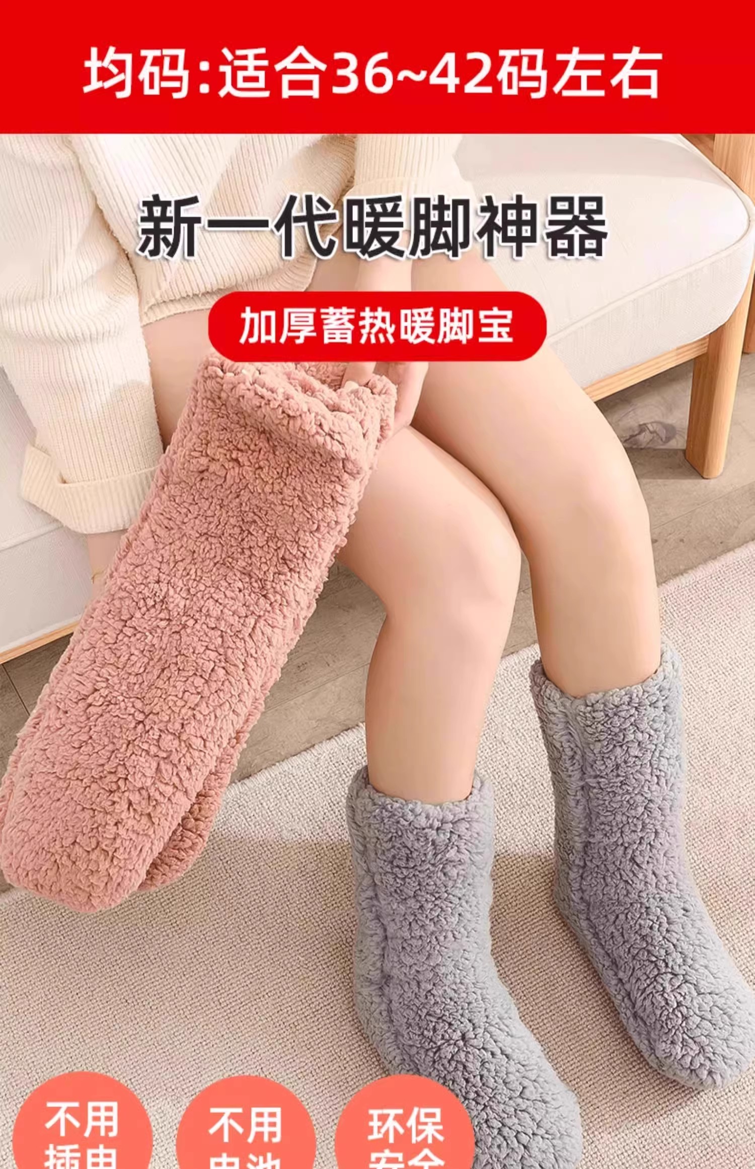 这款暖脚宝超厚发热袜子是一款非常实用的保暖产品,具有多种特点和优势,可以为您的脚和小腿提供全面的保暖效果。暖脚宝不需要插电或使用电池,因此非常环保安全,不会产生任何电磁辐射或安全隐患。内外都加厚加绒,可以全面包裹您的脚和小腿,提供更加保暖的效果。