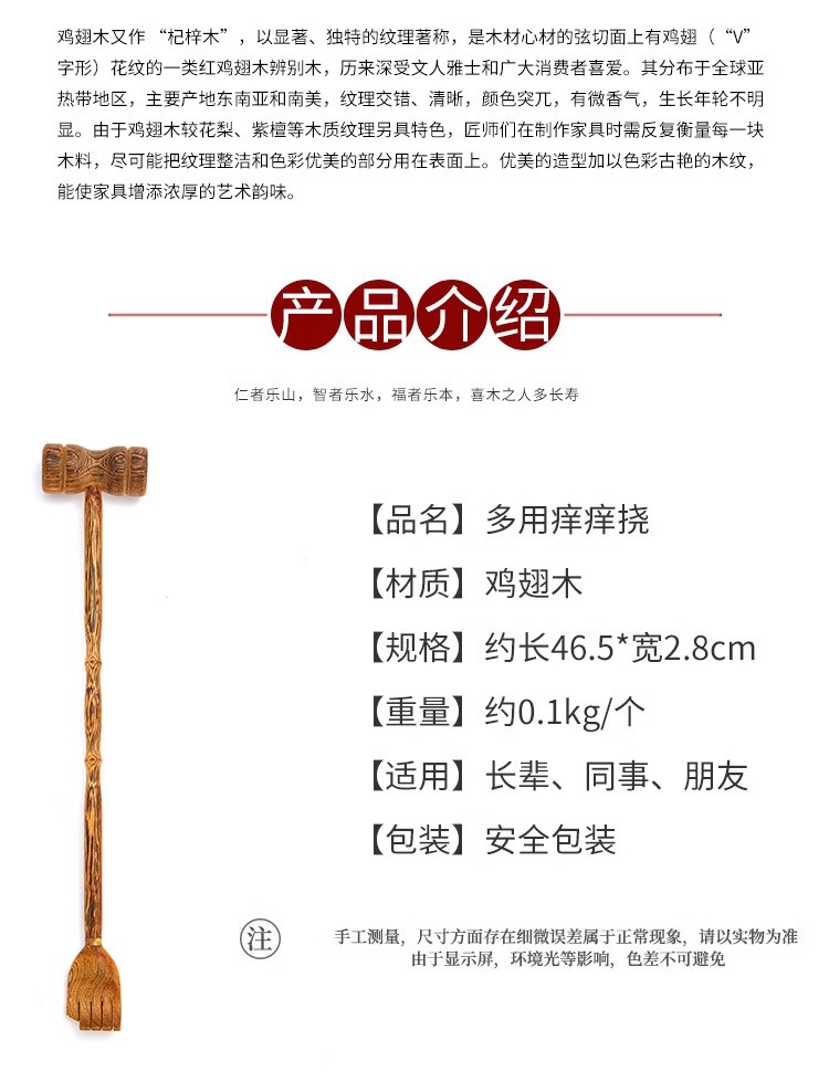 这款痒痒挠选用优质的鸡翅木材质,经过精心的设计和制作,展现出其独特的魅力和价值。鸡翅木是一种优质的木材,具有独特的纹理和色泽,给人一种自然、古朴的感觉。这款痒痒挠选用优质的鸡翅木,经过精细的加工和处理,确保其质地坚硬、耐用,能够承受日常的使用。