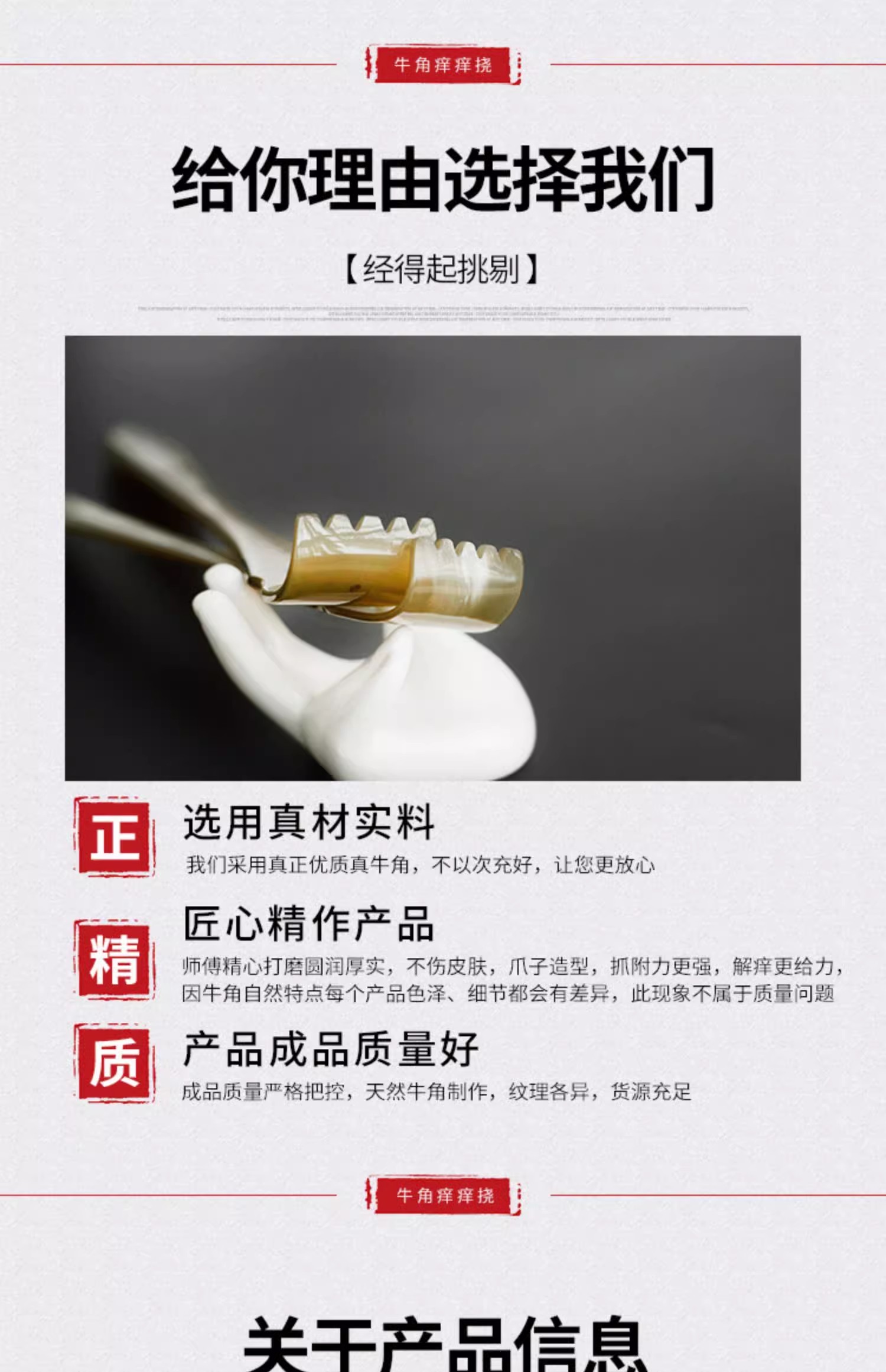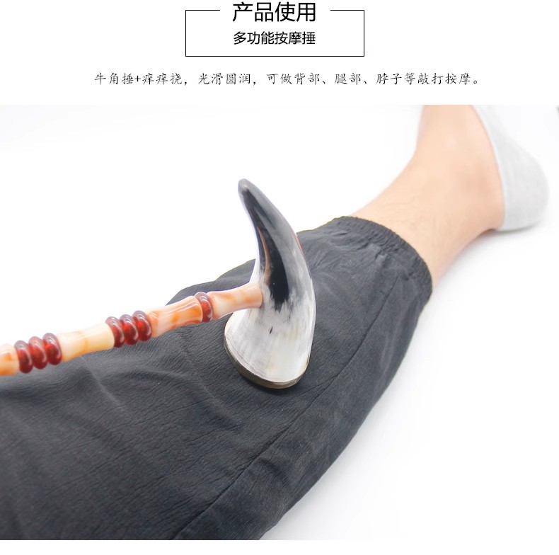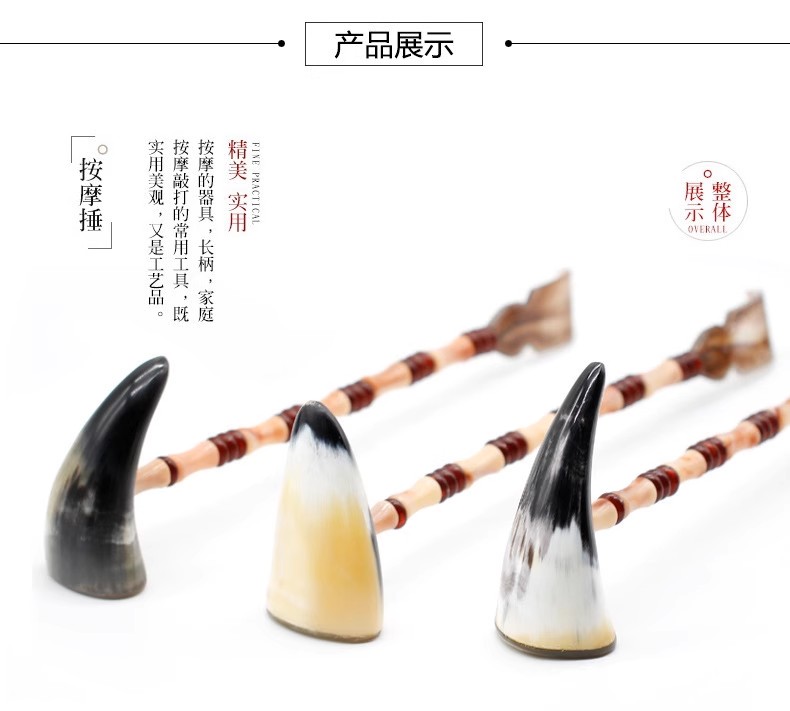 这款牛角痒痒挠是一款集敲打、按摩、挠痒、点穴功能于一体的多功能家居用品。它采用了独特的牛角材质,不仅具有天然的抓力,还保证了使用的舒适度。经过精细的打磨,产品表面光滑无毛点,抓握起来非常舒适。
