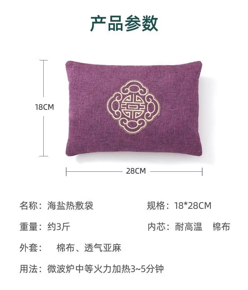 这款粗盐热敷包是一款非常实用、方便、美观的产品。它采用了隐形拉链设计,布套可拆卸,方便清洗,非常人性化。精美刺绣设计,做工精细,颜值在线,多种款式可供选择,总有一款适合你。