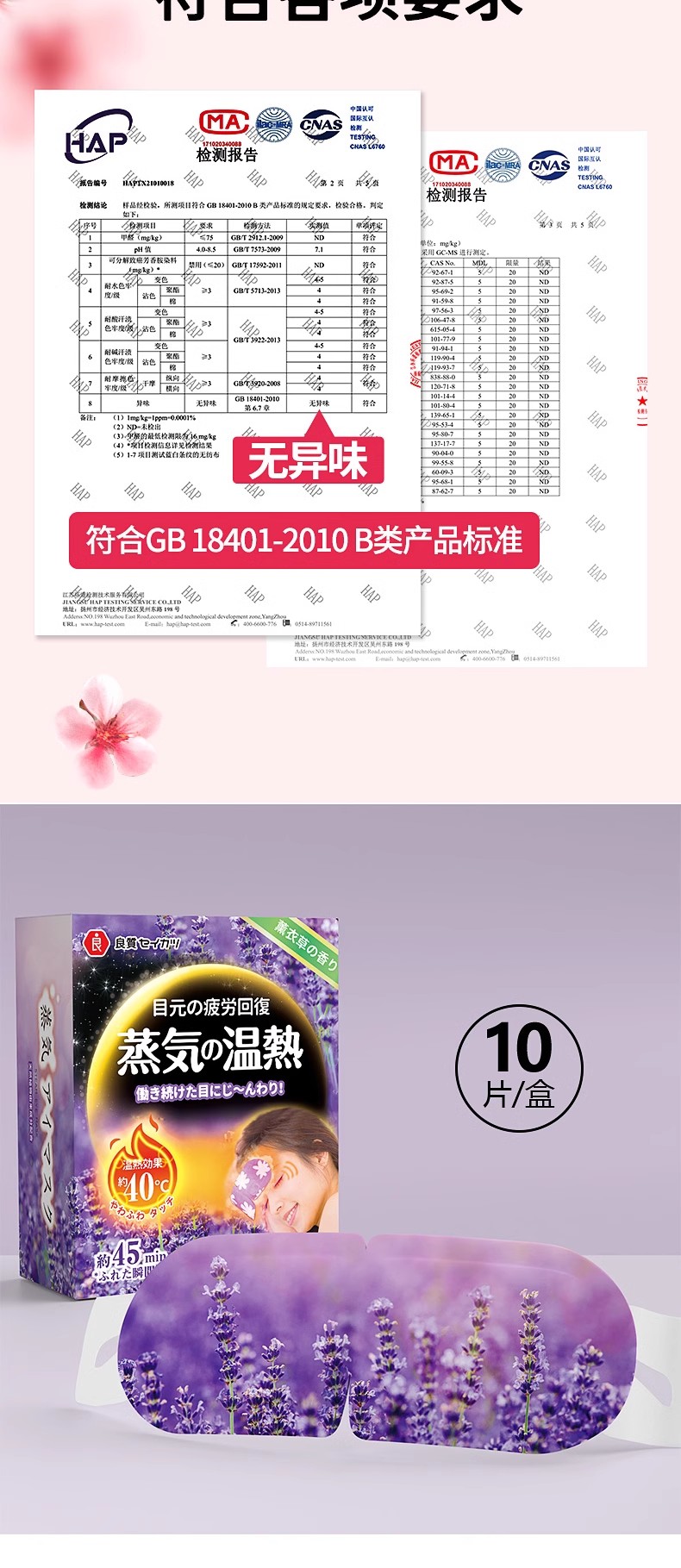 这款蒸汽眼罩加入了薰衣草精油,为眼部护理注入了新的活力。薰衣草精油以其舒缓、放松和恢复活力的特性而闻名,与蒸汽眼罩相结合,能够进一步增强其护理效果。
