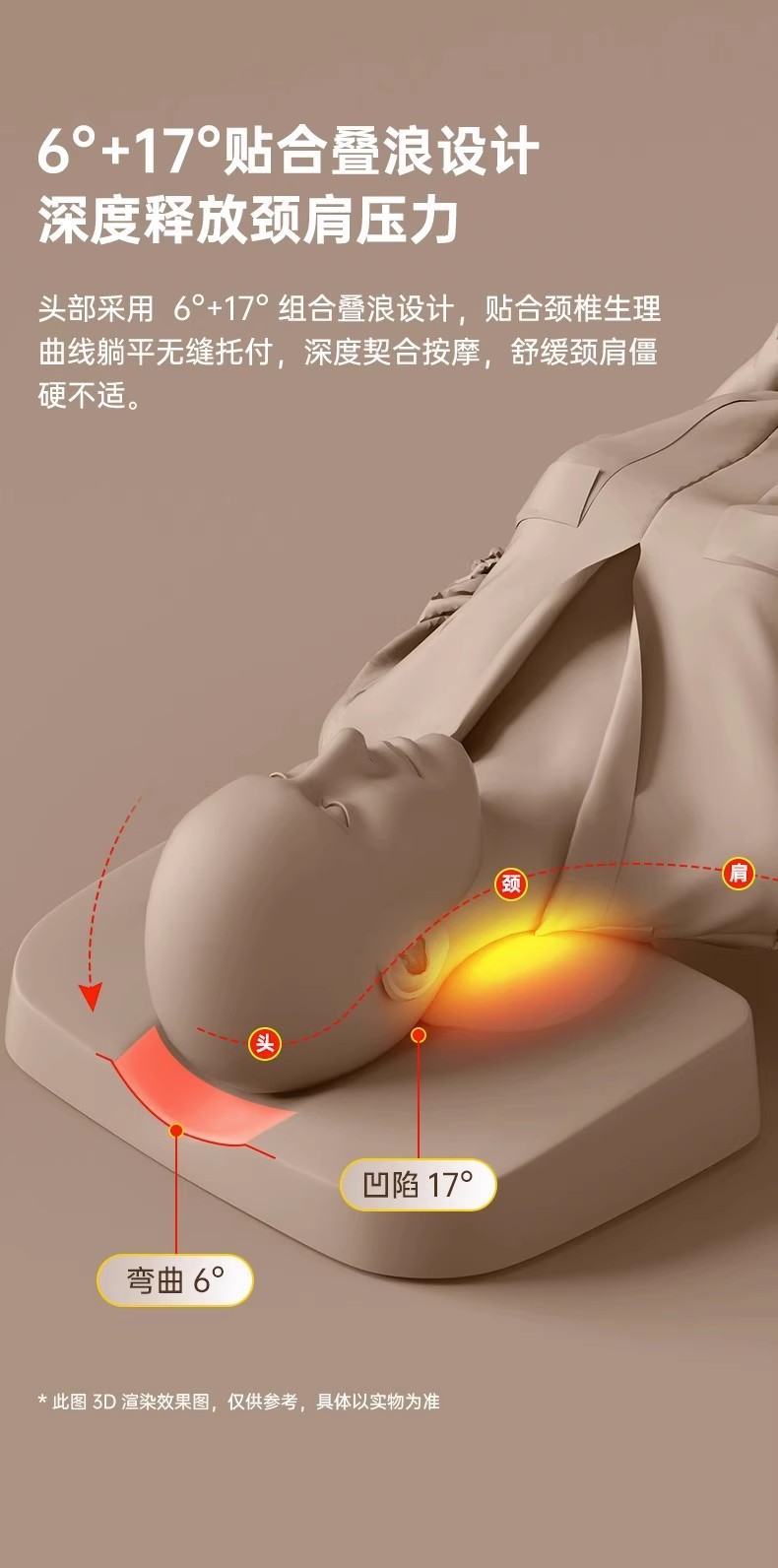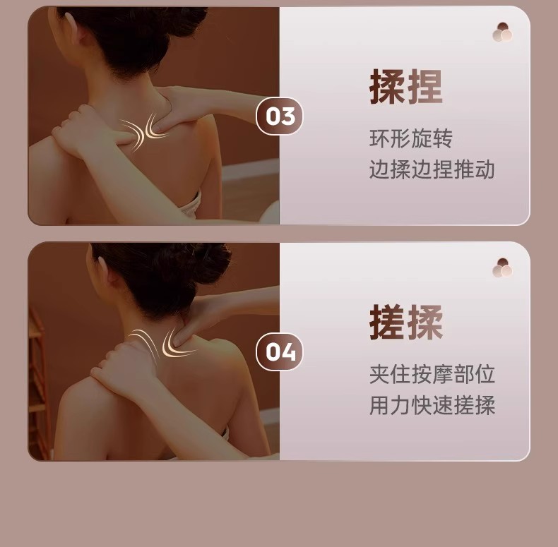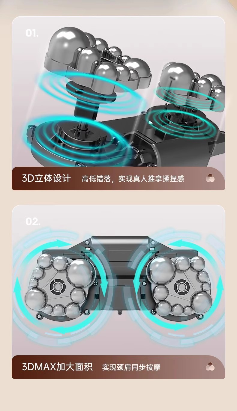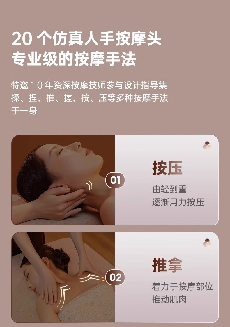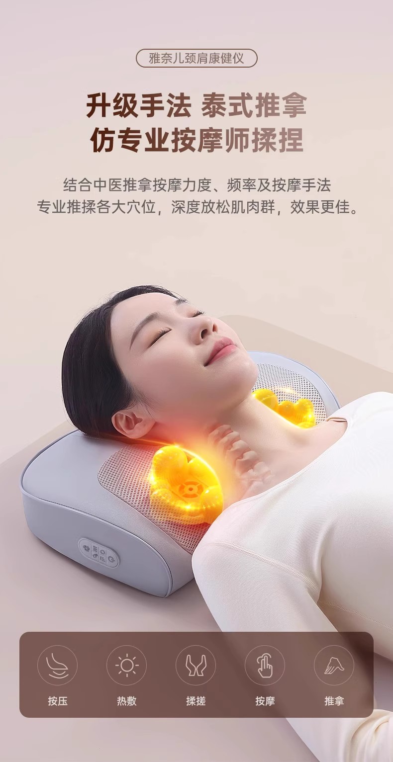 这款颈椎按摩器,通过升级手法,完美融合了泰式推拿技巧,模拟专业按摩师的揉捏动作。结合中医推拿按摩的力度、频率以及专业按摩手法,精准推揉各大穴位,为您的颈部肌肉群带来深度放松,让舒适效果倍增。