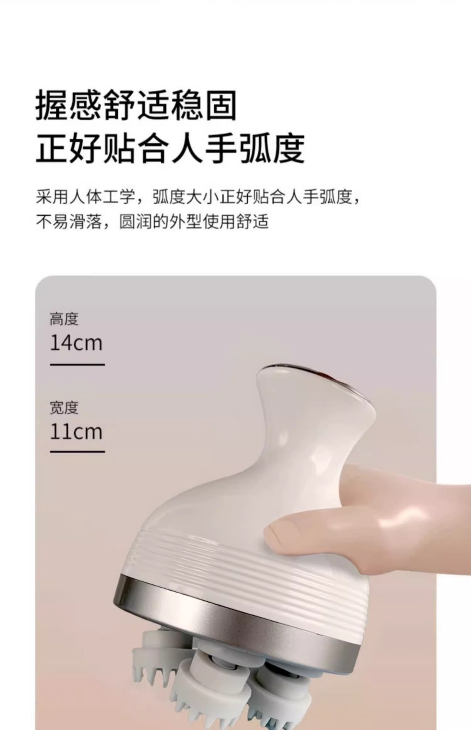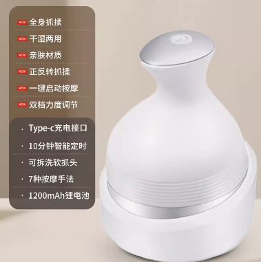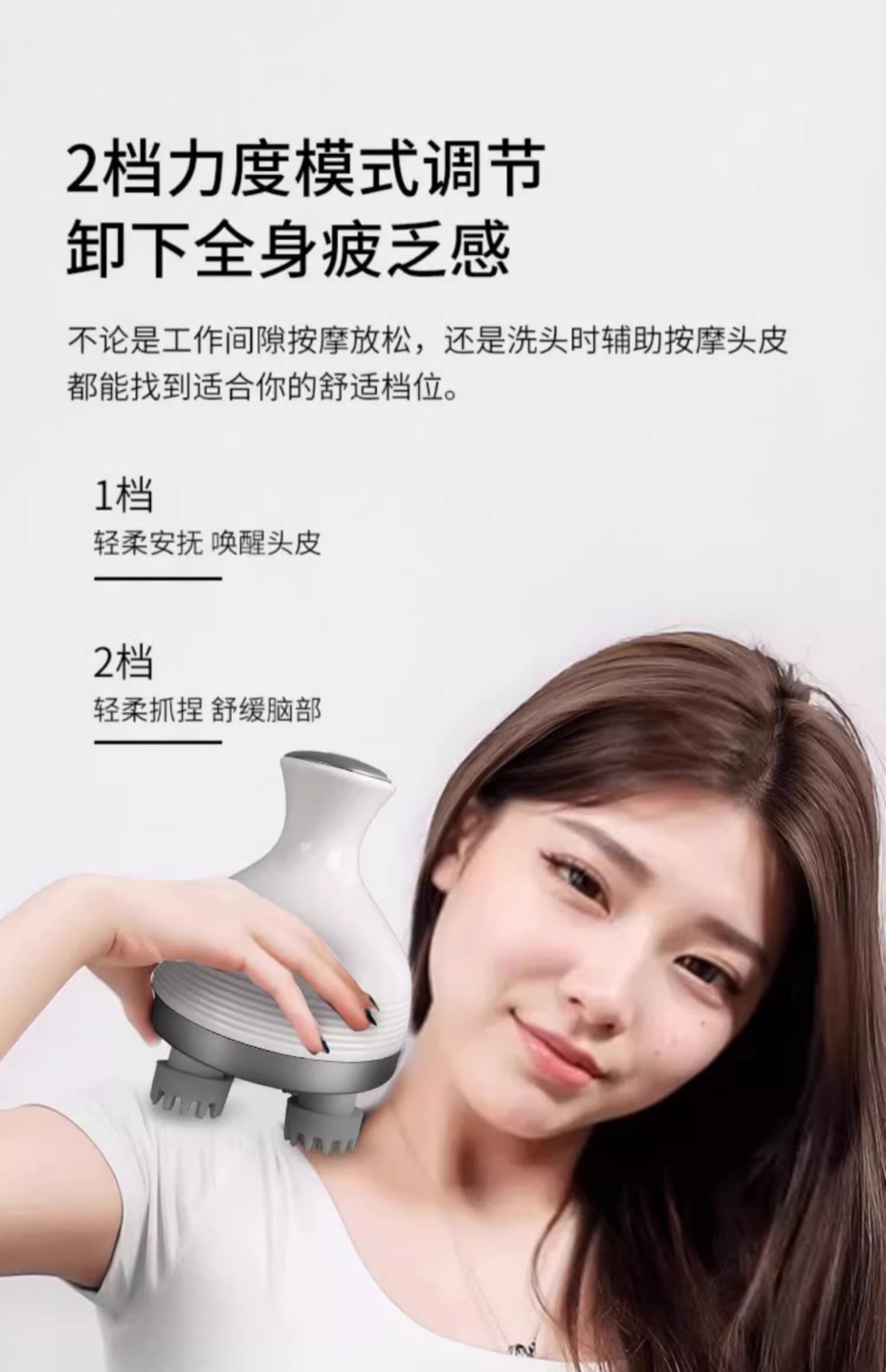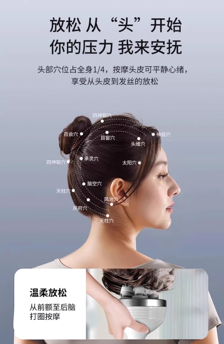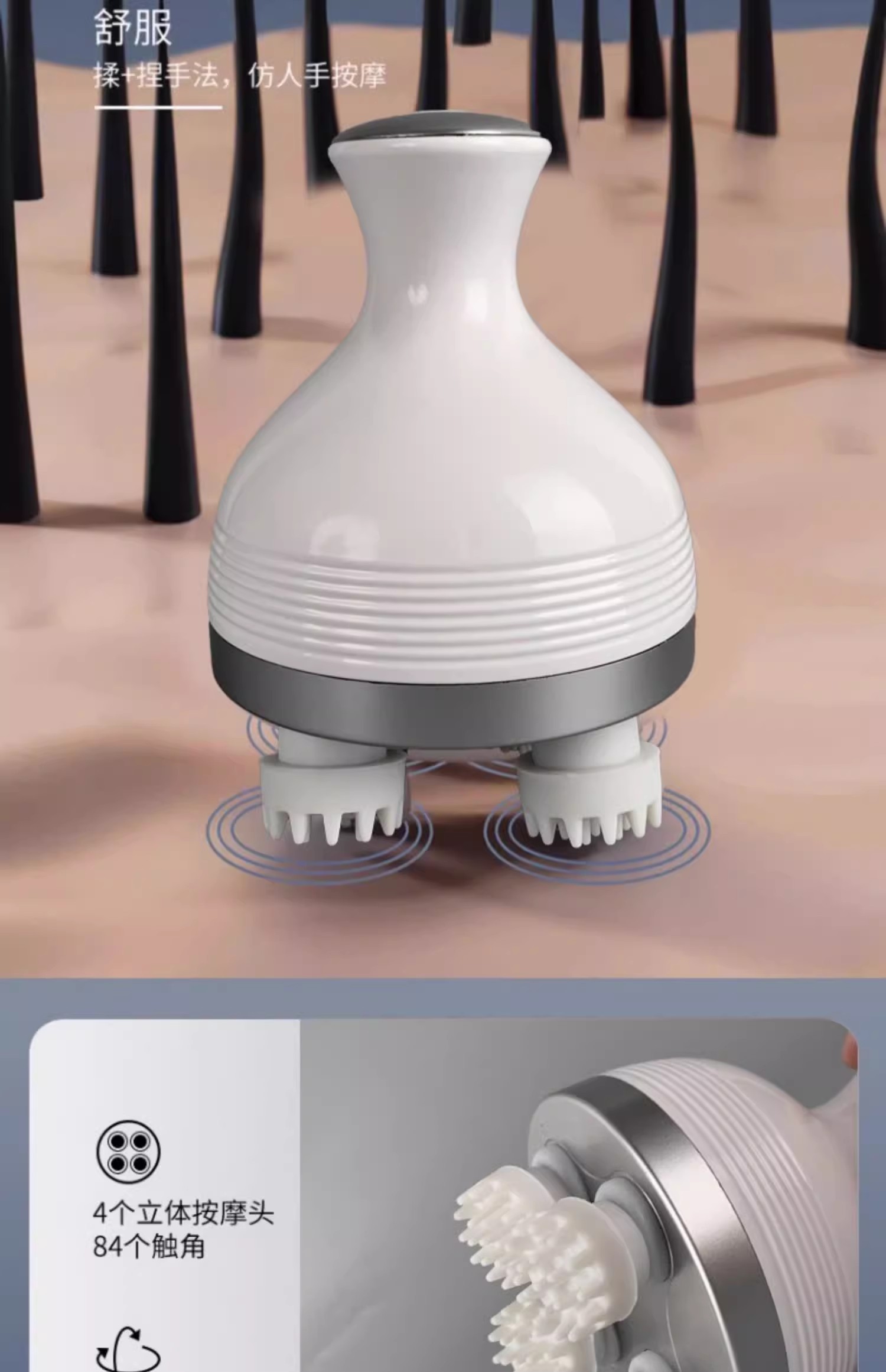 这款电动头部按摩神器是一款为现代人打造的舒压放松工具。其设计理念源于对头部按摩益处的深入理解,通过独特的按摩方式,旨在帮助用户缓解压力,放松身心。4个立体按摩头设计,模拟人手指压按摩,能深入触及头皮,帮助促进血液循环。84个触角全方位触达头部穴位,360度旋转揉捏按摩,带给您前所未有的舒适体验。舒适力度调节,无论您是想要轻柔的放松还是深层的舒压,都能找到适合您的力度。