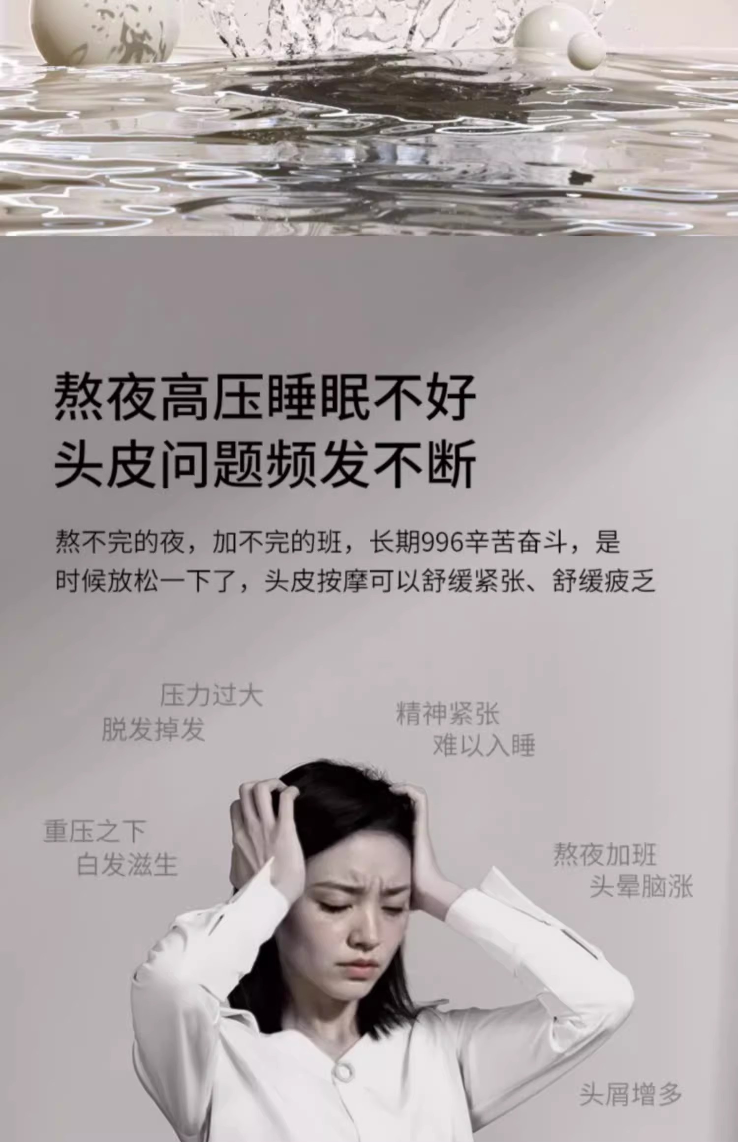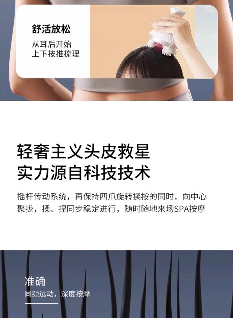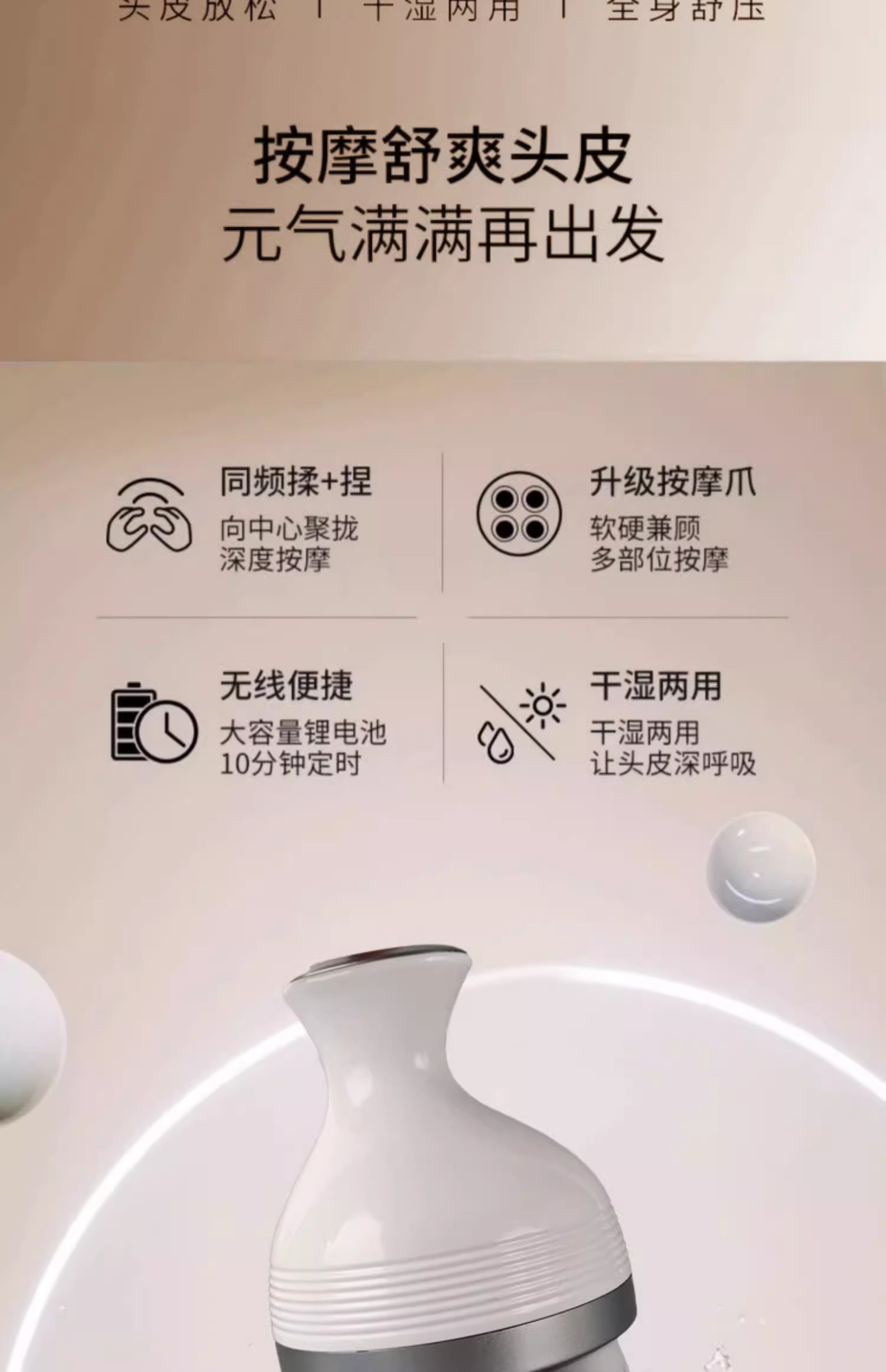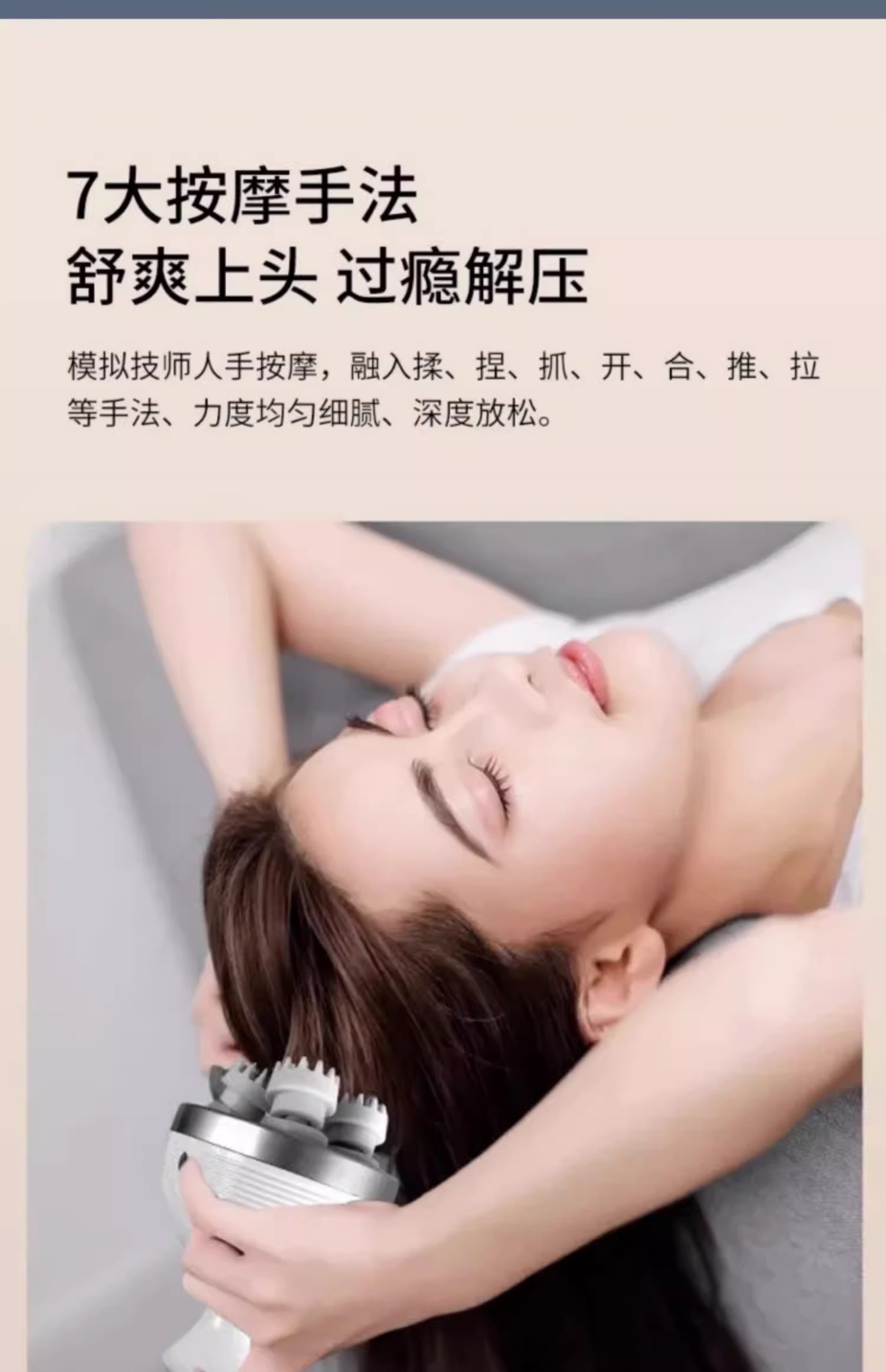 这款电动头部按摩神器是一款为现代人打造的舒压放松工具。其设计理念源于对头部按摩益处的深入理解,通过独特的按摩方式,旨在帮助用户缓解压力,放松身心。4个立体按摩头设计,模拟人手指压按摩,能深入触及头皮,帮助促进血液循环。84个触角全方位触达头部穴位,360度旋转揉捏按摩,带给您前所未有的舒适体验。舒适力度调节,无论您是想要轻柔的放松还是深层的舒压,都能找到适合您的力度。