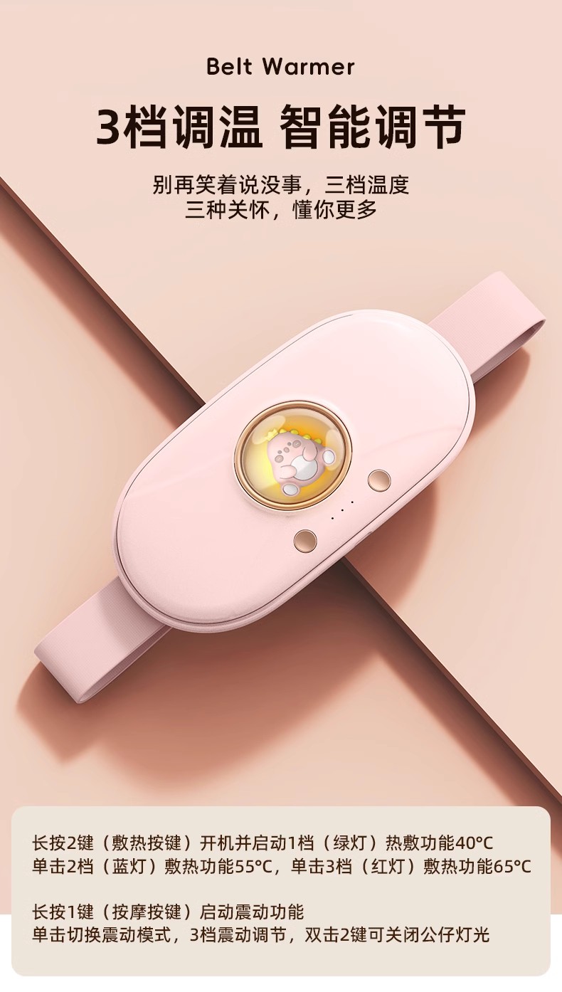 这款暖宫腰带还配备了三档震动按摩功能,能够深入腹部进行按摩,有效缓解腹部疼痛和不适感。其温柔的震动和热流,能够让用户感受到舒适和放松,缓解紧张和焦虑情绪。