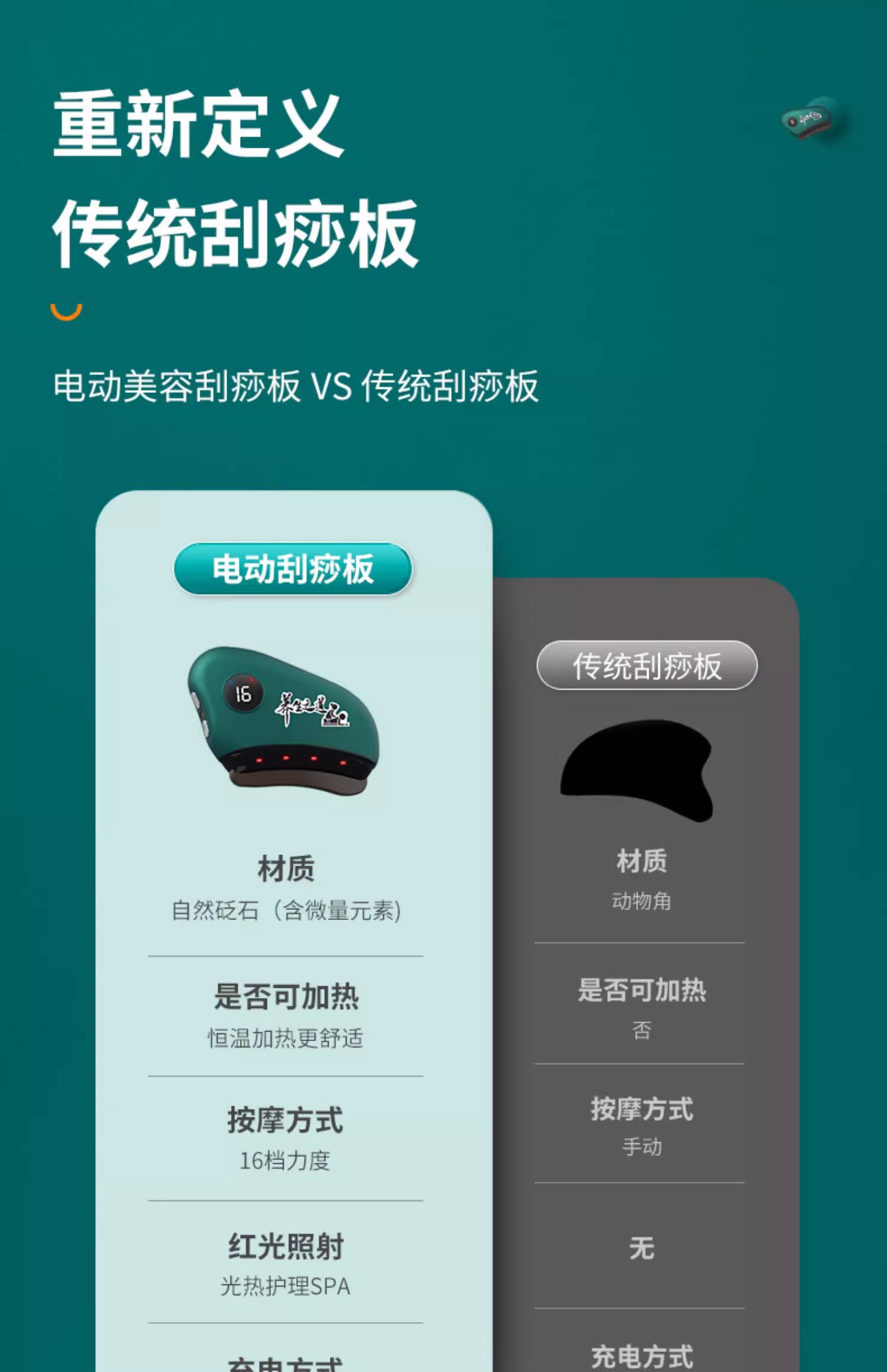 这款普通款刮痧板采用高频率震动按摩技术,能够有效地帮助放松肌肉和皮下神经,舒缓身体的疲劳感。双边红光照射功能可以加速肌肤的微循环,促进皮肤对微量元素的吸收,使肤色更加健康和亮丽。