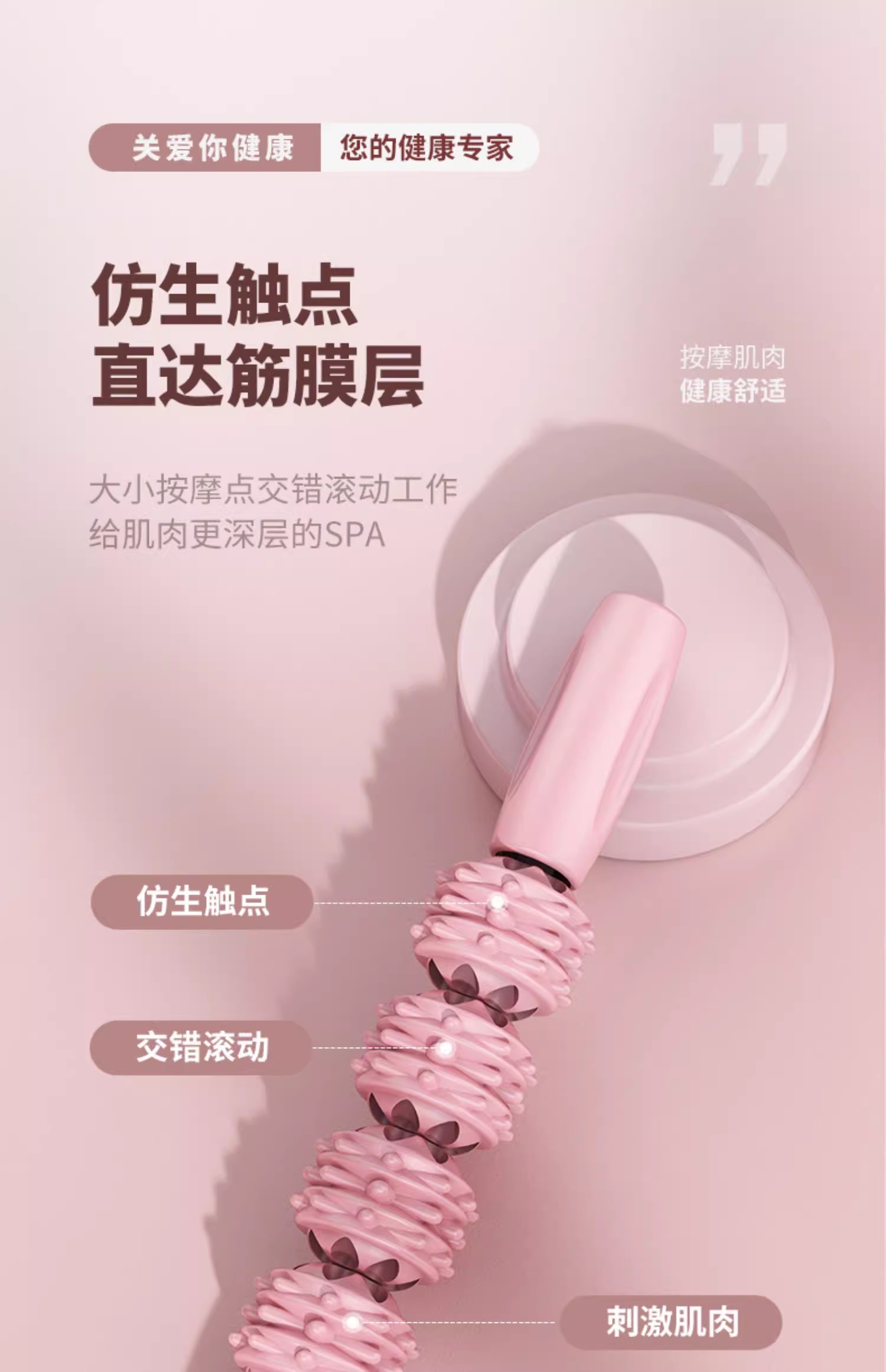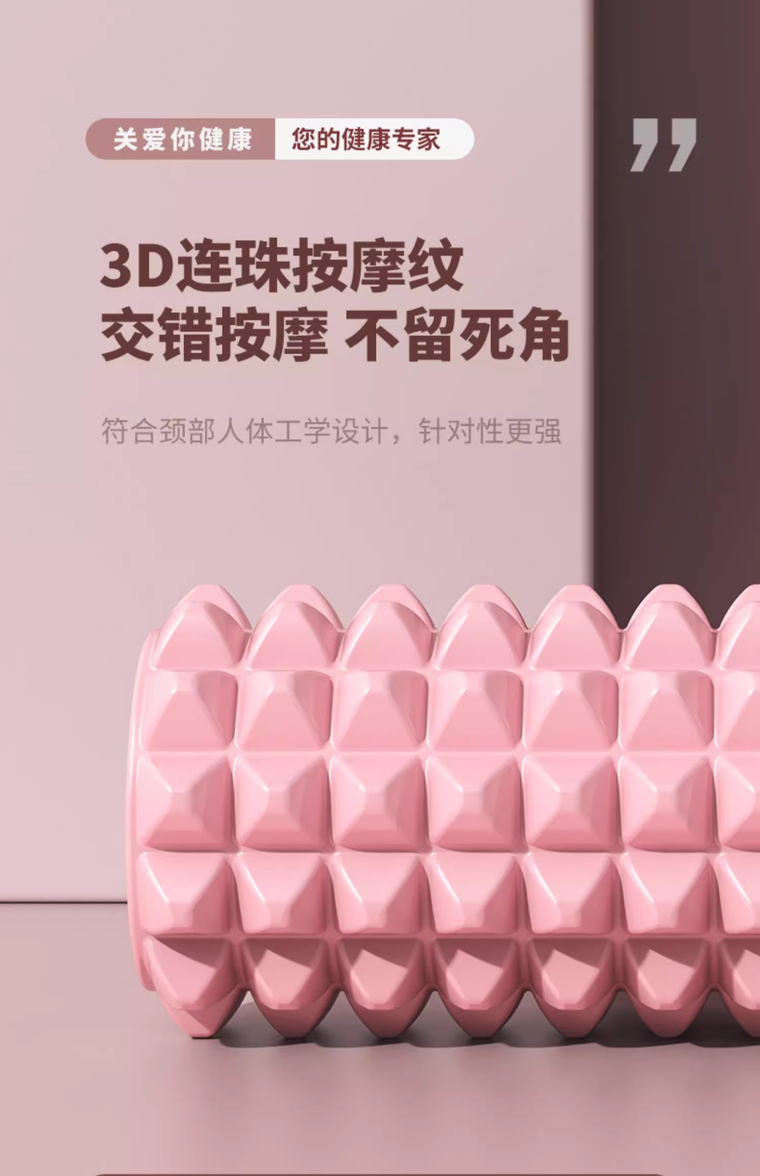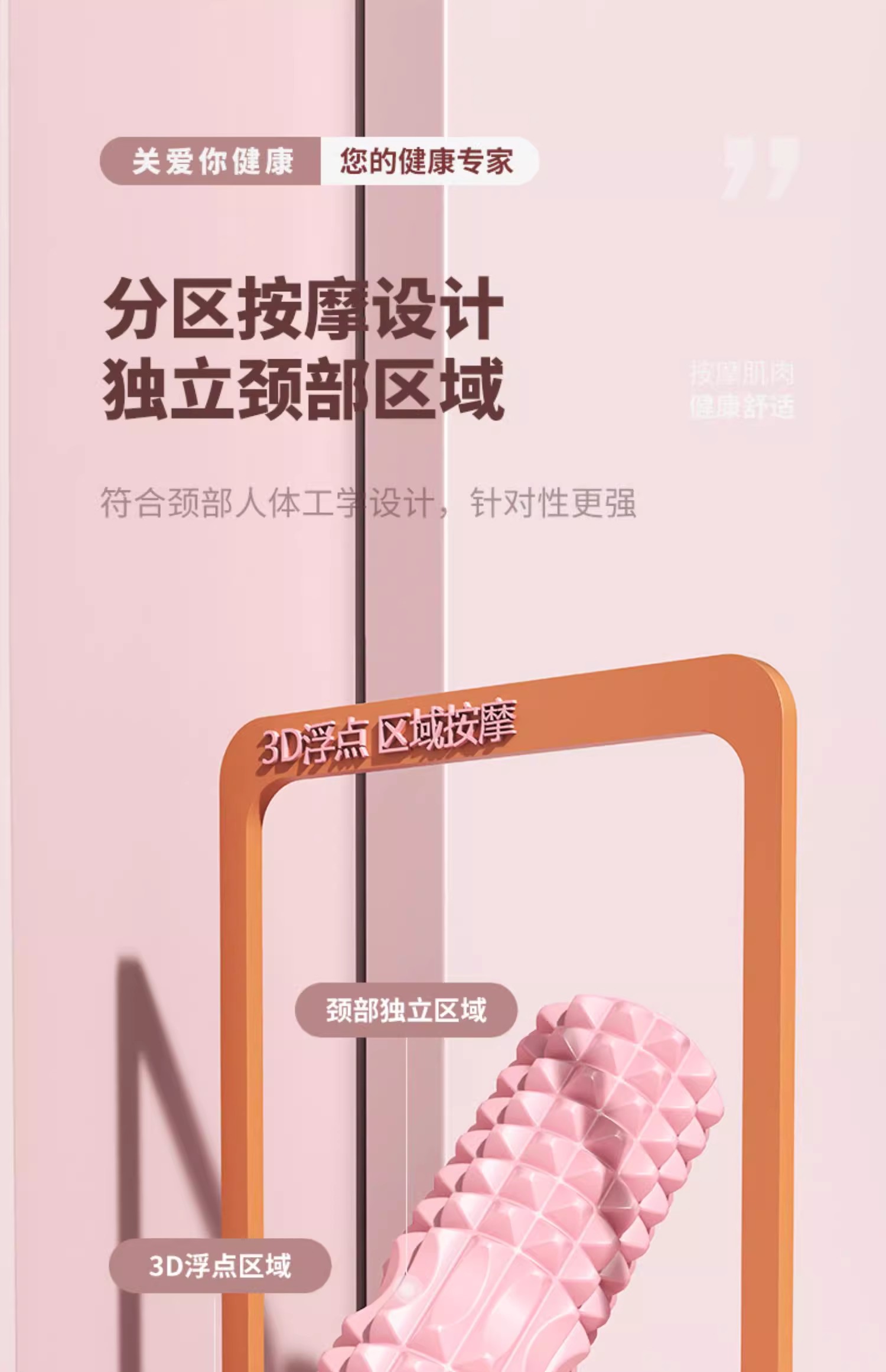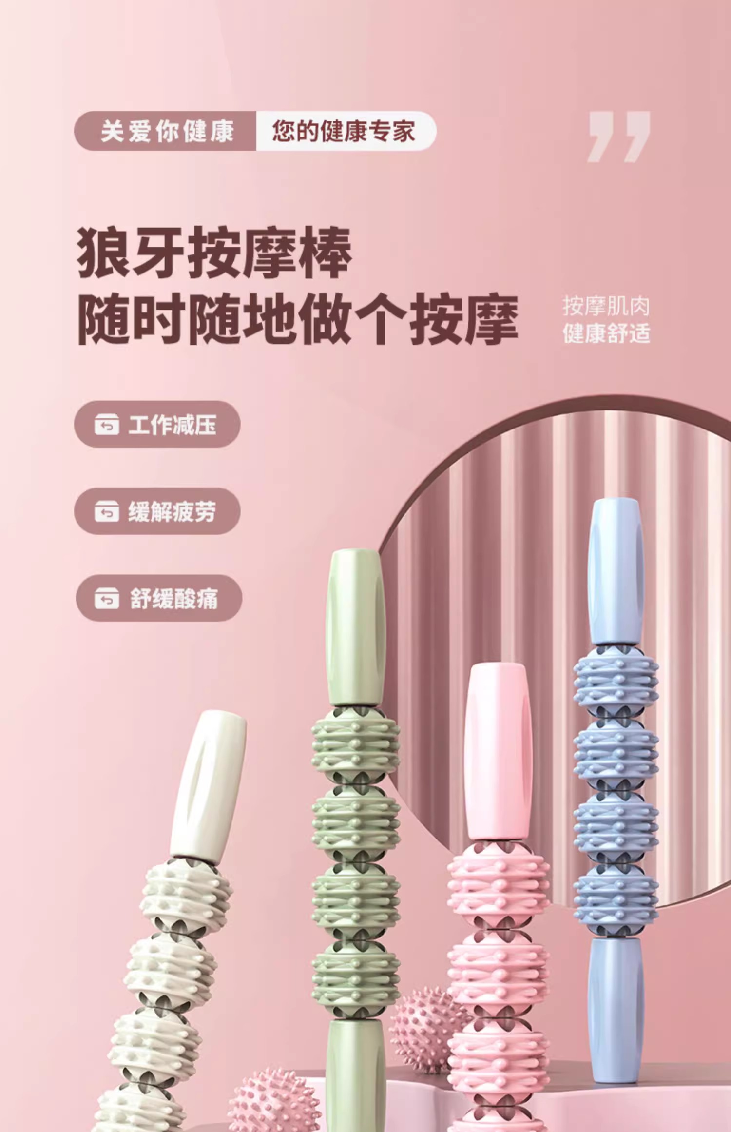 这款狼牙按摩棒是专门为颈部设计的,它的人体工学设计让按摩效果更贴合颈部线条,按摩针对性更强。此外,该按摩棒采用分区按摩设计,特别是针对颈部区域进行了独立设计。3D连珠按摩纹的交错设计,确保了按摩过程中不留死角,大小按摩点交错滚动工作,可以更深层次地放松肌肉。刺猬球凸点设计则能深入肌理,直击痛点,提供更深入的按摩体验。