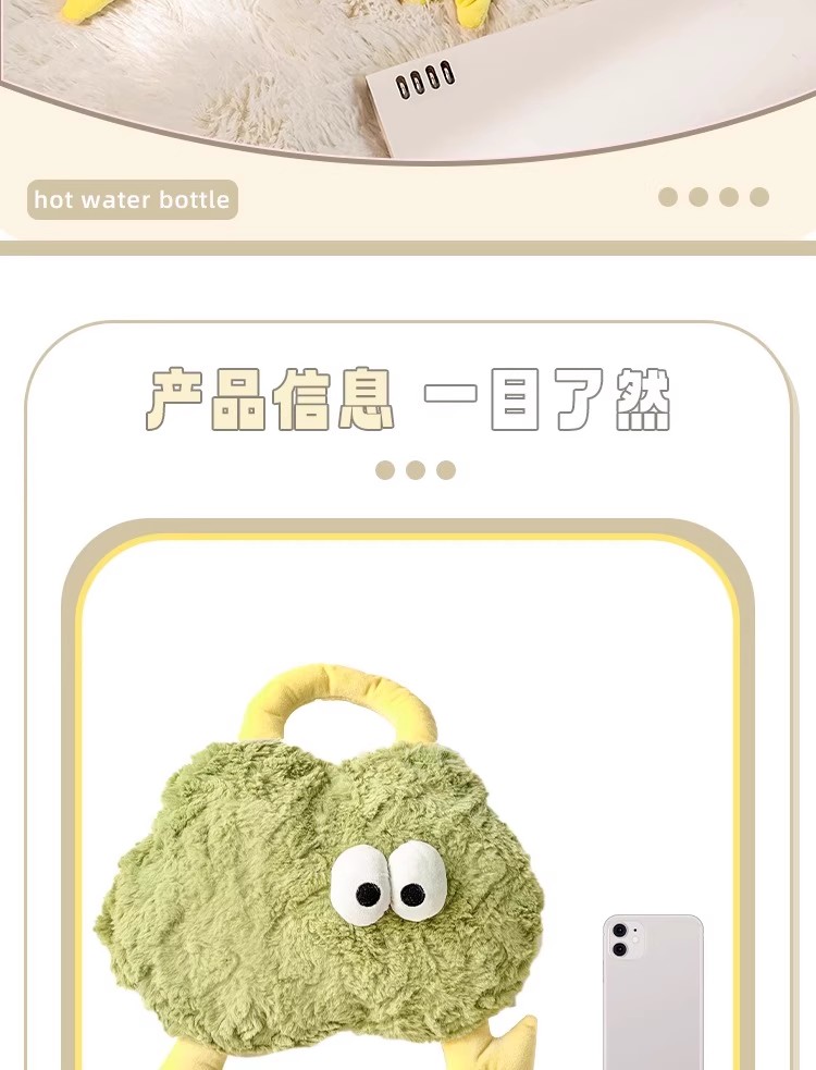 这款新款暖水袋拥有可爱的外观设计,外套采用可拆洗设计,方便清洁和保养。它采用普通水作为加热介质,安全卫生,拒绝易腐蚀的化学液体。双插口设计不仅美观,而且更加实用,方便您同时使用两个插口。