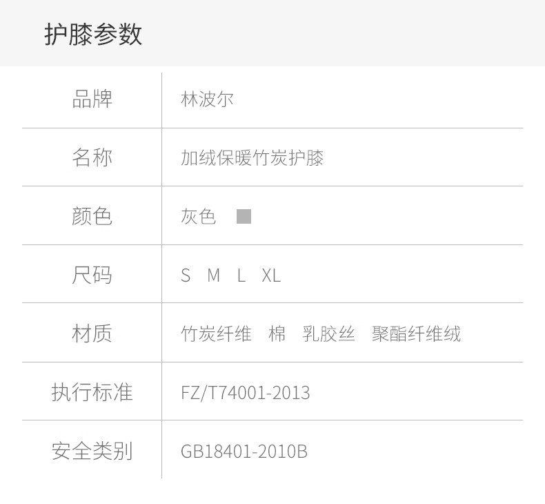 这款竹炭保暖护膝,采用棉质内里,加上加绒设计,能有效地蓄热保暖。四面弹力的结构设计,适应各种腿型,让您穿戴舒适,不勒腿。