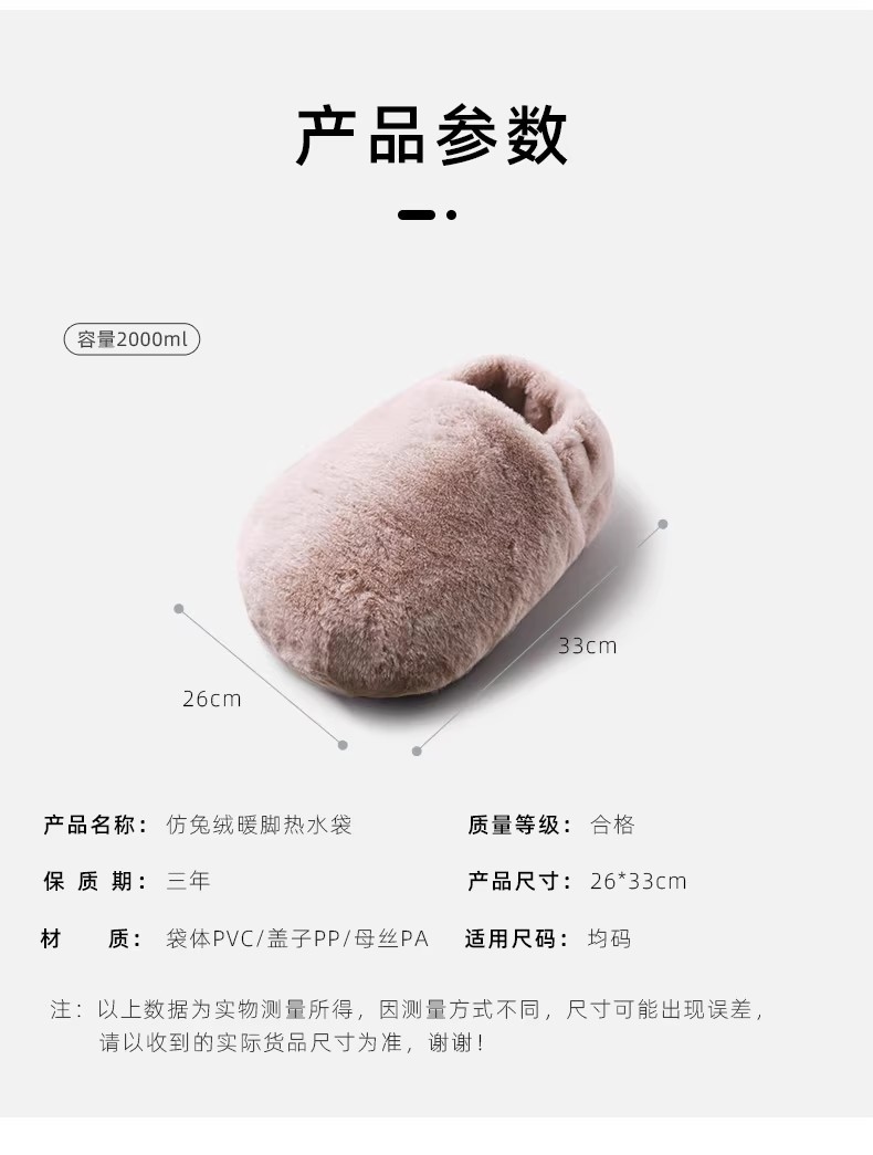 亲肤的质感,均匀散热,以及保暖防烫的特点,让这款暖脚宝成为您冬季暖脚的理想选择。加宽的注水口设计可以防止烫伤,螺旋盖子凹槽防漏设计增强了密封性,让您在使用过程中更加安心。