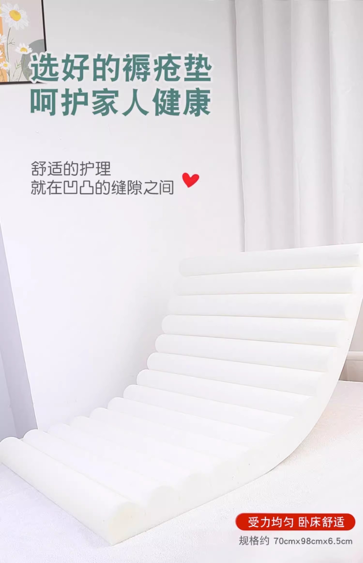 这款防压疮专用垫专为预防压疮而设计,独特的波浪形设计能够完美贴合身体曲线,有效分散压力,避免局部长时间受压。波浪形设计通风透气,保持空气流通,降低皮肤潮湿度,有效预防压疮形成。使用高弹海绵作为垫芯,可承受大量压力并均匀分散,使卧床更加舒适。垫子采用一体切割技术,确保边缘平滑无毛边,减少对皮肤的刺激和损伤。